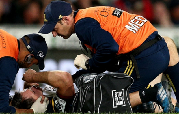 The All Black looked groggy as he walked off the field with assistance from medics.