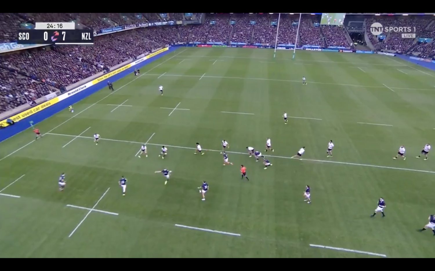 Finn Russell with a brilliant bit of tactical understanding as he and Scotland attack with advanatage but knowing the wings will shoot up he pops a perfect spiral kick for a 50/22