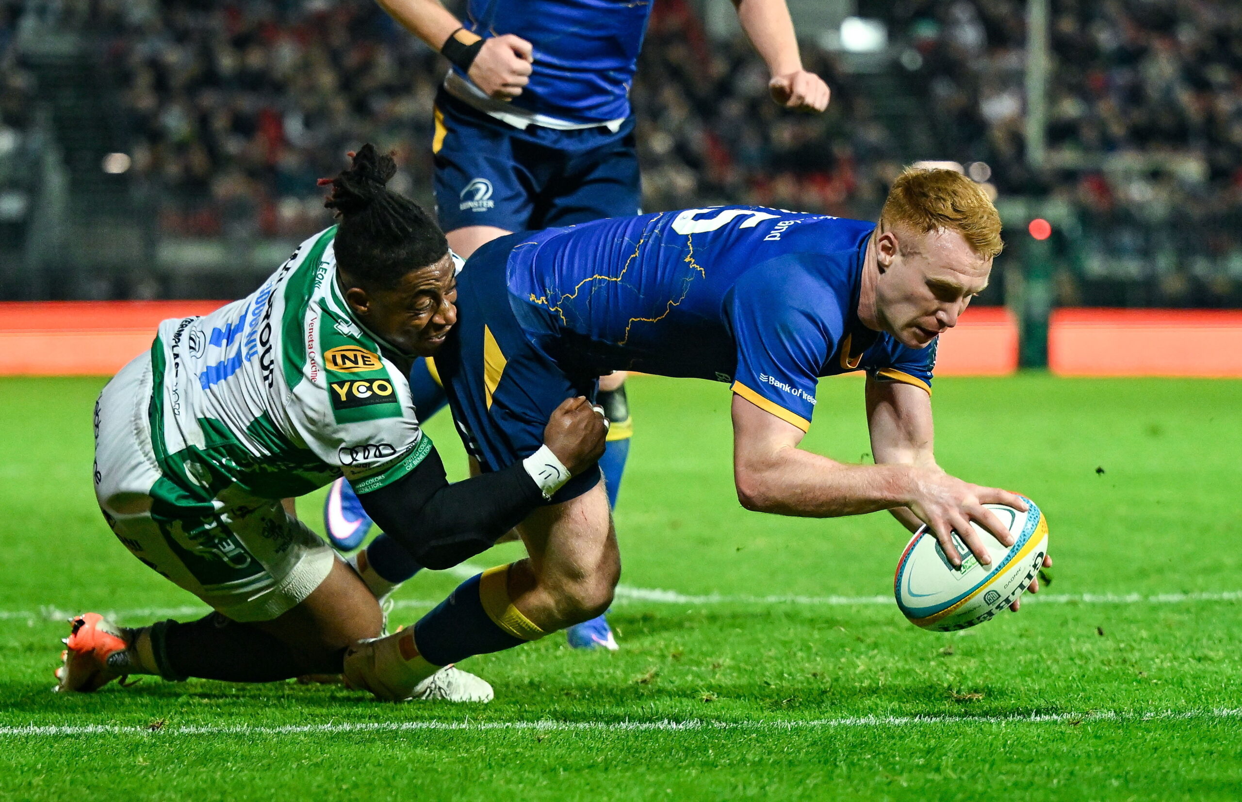 Brian Deeny, Harry Byrne, Tadhg Furlong and Jack Conan all had a pop at the line. Finally, O’Tighearnaigh rode a tackle to score his first senior try. Byrne converted as Leinster took a 7-5 lead in the 15th minute.