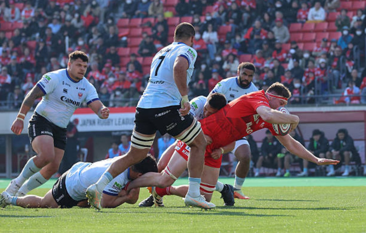 Kobe fullback Shunsuke Uenobo crossed for the first of what would become a hattrick of tries in just the second