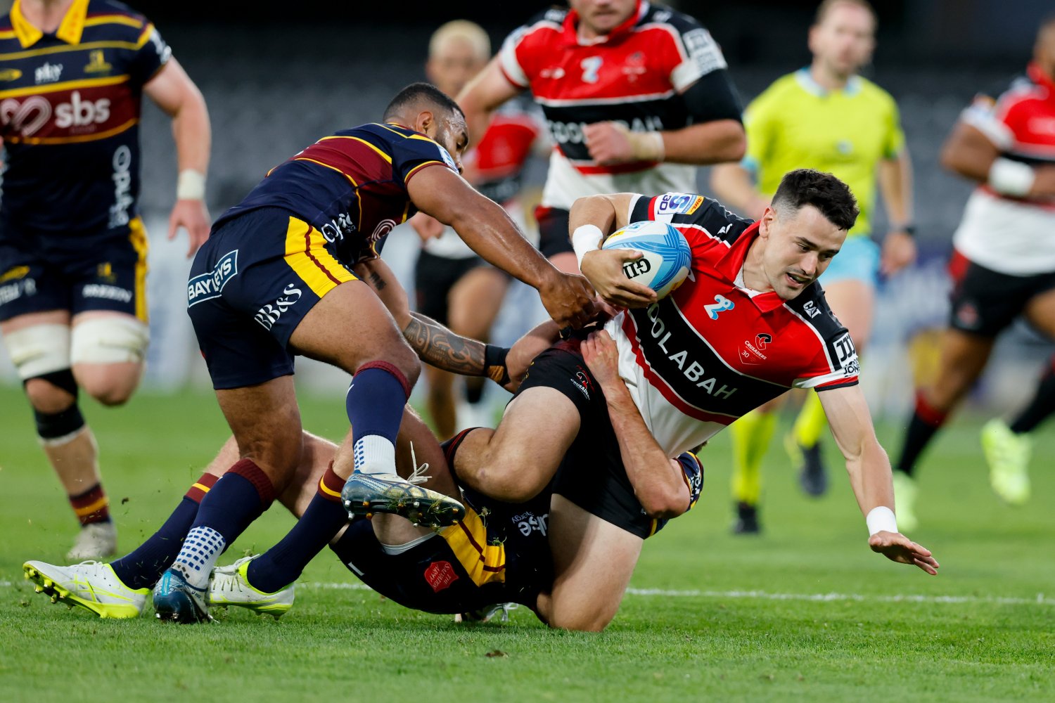 The turning point of the half came down the right edge. After a kick battle, Sevu Reece picked up a loose ball and broke into space, linking inside with Blackadder to drive us deep into Highlander's territory. With the defence turning, Noah Hotham spotted an opportunity down the short side, darting through to score our first try of the season.