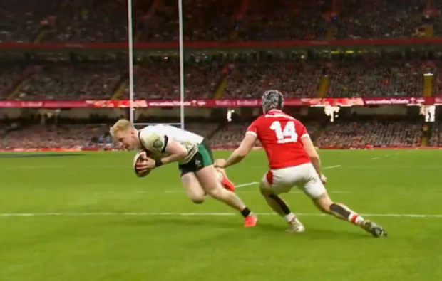 A clinical Sam Prendergast cross kick found James Lowe in the corner who's basketball pass found a surging Jamie Osborne who scored the bring Ireland level. See below: