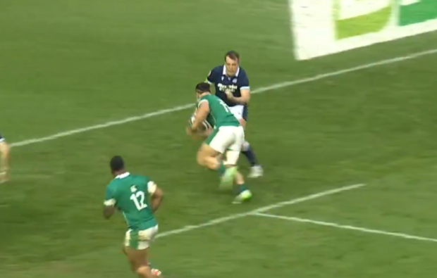 Scotland were first to get on the board in the second-half through a Blair Kinghorn penalty. However Irish winger James Lowe had something to say about that as he crossed the line for a strong finish to extend the Irish lead. See below: