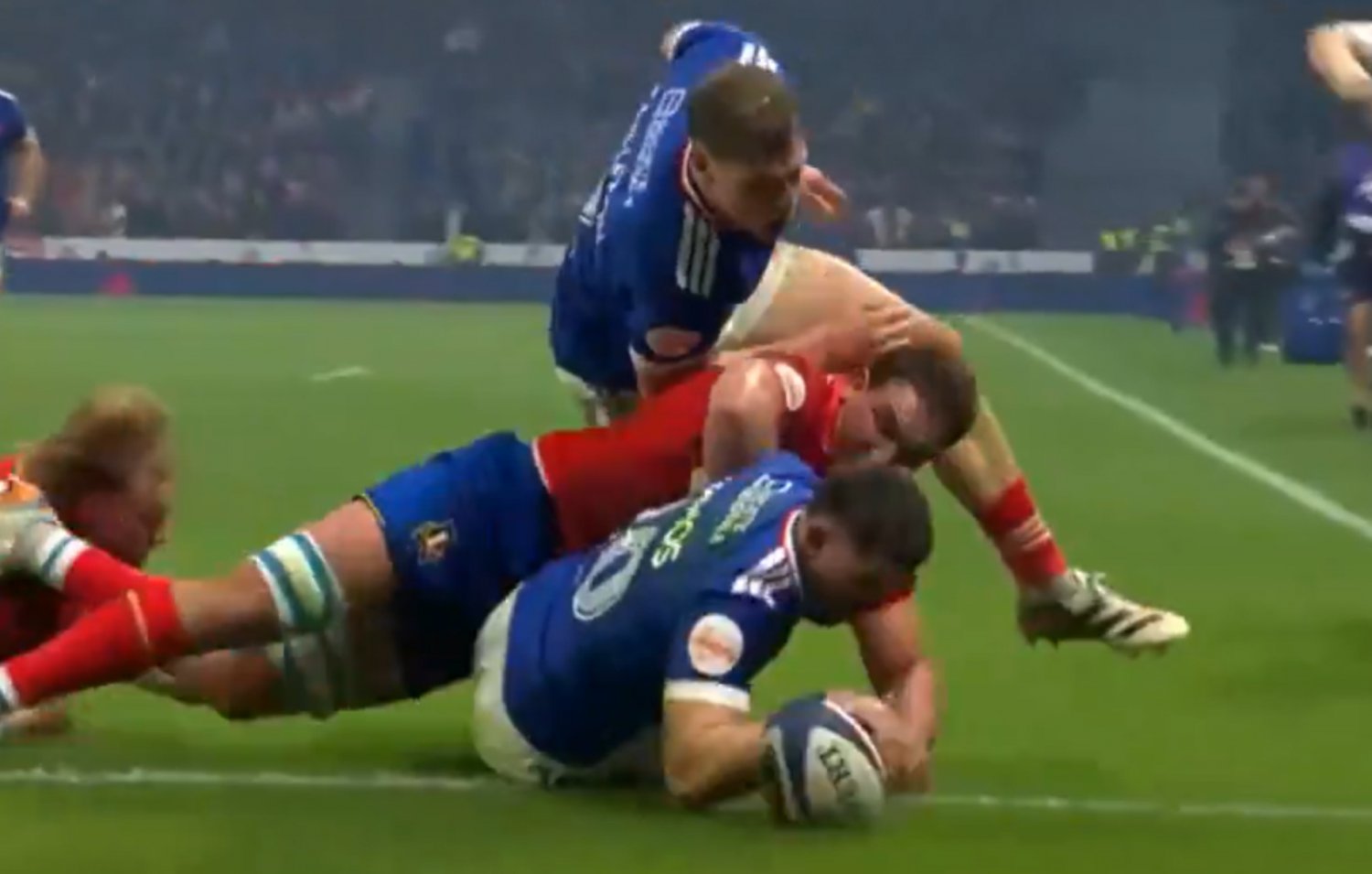 Émilien Gailleton breaks through and offloads to Thomas Ramos who scores on his 50th cap