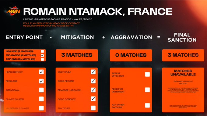 Ntamack has been suspended for “foul play contrary to rule 9.13″, which means he will miss the game against England on Saturday - confirmation of remaining match(es) will be confirmed in due course.