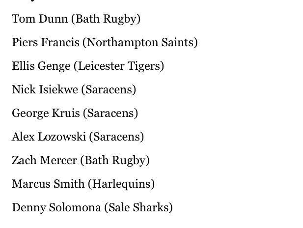 Mike Brown, Elliot Daly, Jonny May, Semesa Rokoduguni, Anthony Watson, Danny Care, Owen Farrell, George Ford, Jonathan Joseph, Henry Slade, Ben Youngs, Charlie Ewels, Nathan Hughes, Maro Itoje, Joe Launchbury, Courtney Lawes, Chris Robshaw, Sam Simmonds, Sam Underhill, Dan Cole, Jamie George, Dylan Hartley, Joe Marler, Mako Vunipola, Harry Williams.