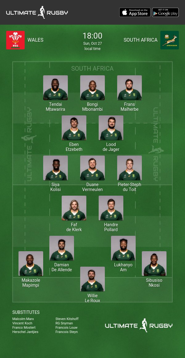 The Springbok team to play Wales in Yokohama on Sunday is: