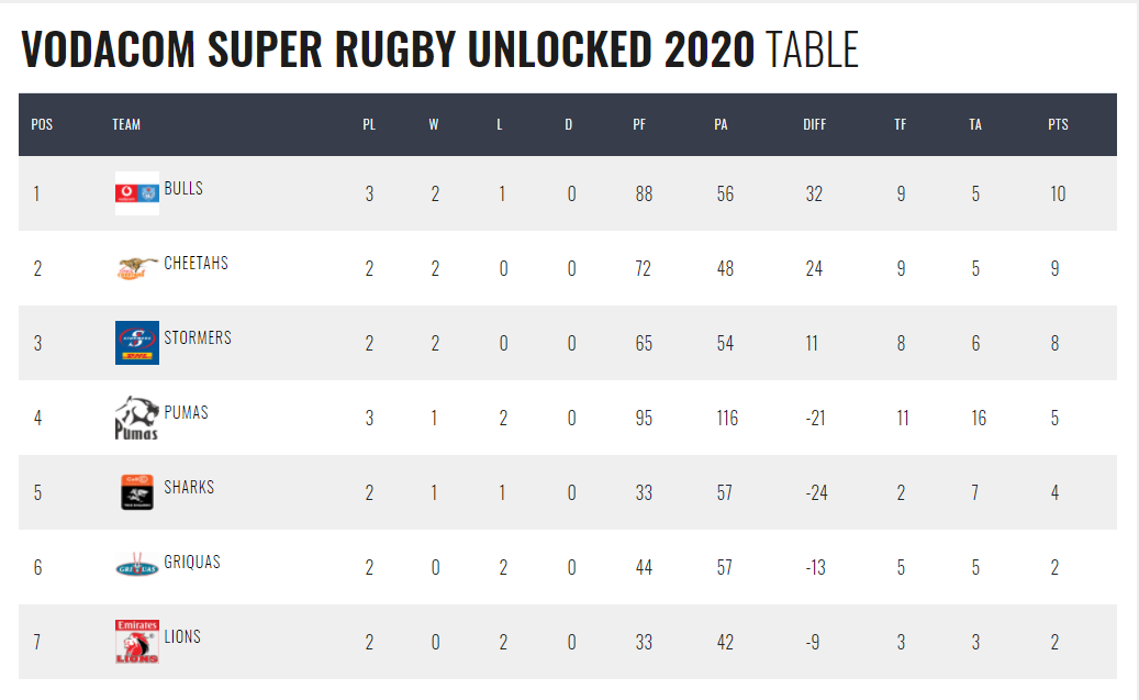 As a result of the Bulls’ dominant 41-14 victory over the Sharks at Loftus Versfeld, the men from Pretoria have shot to the top of the standings with 10 points from three games. The Cheetahs are second on nine points from their two games.
